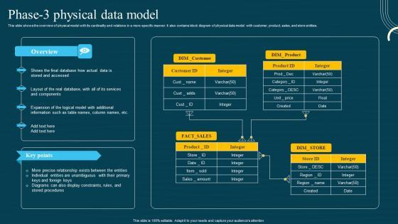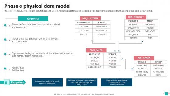 This slide shows the overview of physical model with its cardinality and relations in a more specific manner. It also contains block diagram of physical data model with customer, product, sales, and store entities. Make sure to capture your audiences attention in your business displays with our gratis customizable Database Modeling Phase 3 Physical Data Model Graphics Pdf. These are great for business strategies, office conferences, capital raising or task suggestions. If you desire to acquire more customers for your tech business and ensure they stay satisfied, create your own sales presentation with these plain slides. This slide shows the overview of physical model with its cardinality and relations in a more specific manner. It also contains block diagram of physical data model with customer, product, sales, and store entities.