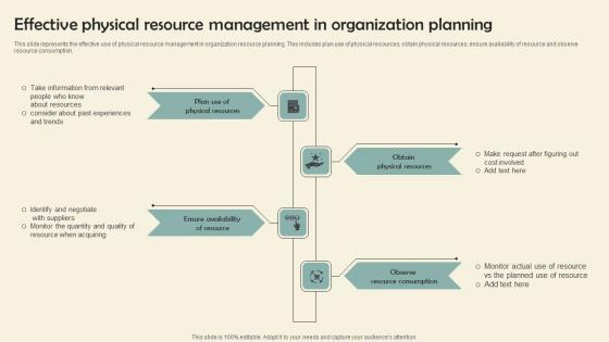 This slide represents the effective use of physical resource management in organization resource planning. This includes plan use of physical resources, obtain physical resources, ensure availability of resource and observe resource consumption.Pitch your topic with ease and precision using this Effective Physical Resource Management In Organization Planning Sample Pdf This layout presents information on Physical Resources, Ensure Availability, Obtain Physical Resources It is also available for immediate download and adjustment. So, changes can be made in the color, design, graphics or any other component to create a unique layout. This slide represents the effective use of physical resource management in organization resource planning. This includes plan use of physical resources, obtain physical resources, ensure availability of resource and observe resource consumption.