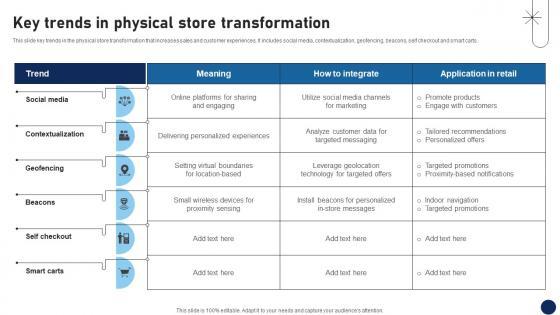 This slide key trends in the physical store transformation that increases sales and customer experiences. It includes social media, contextualization, geofencing, beacons, self checkout and smart carts.There are so many reasons you need a Key Trends In Physical Store Transformation DT SS V. The first reason is you can not spend time making everything from scratch, Thus, Slidegeeks has made presentation templates for you too. You can easily download these templates from our website easily. This slide key trends in the physical store transformation that increases sales and customer experiences. It includes social media, contextualization, geofencing, beacons, self checkout and smart carts.