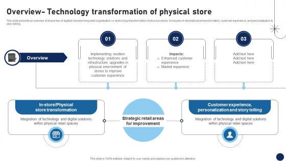 This slide presents an overview of phase two of digitally transforming retail organization i.e. technology transformation of physical stores. It includes in-store or physical transformation, customer experience, and personalization and story telling.Coming up with a presentation necessitates that the majority of the effort goes into the content and the message you intend to convey. The visuals of a PowerPoint presentation can only be effective if it supplements and supports the story that is being told. Keeping this in mind our experts created Overview Technology Transformation Of Physical Store DT SS V to reduce the time that goes into designing the presentation. This way, you can concentrate on the message while our designers take care of providing you with the right template for the situation. This slide presents an overview of phase two of digitally transforming retail organization i.e. technology transformation of physical stores. It includes in-store or physical transformation, customer experience, and personalization and story telling.