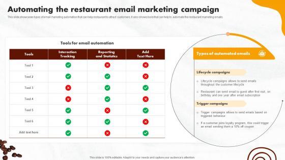 This slide showcases types of email marketing automation that can help restaurant to attract customers. It also shows tools that can help to automate the restaurant marketing emails. There are so many reasons you need a Online Promotional Activities Automating The Restaurant Pictures Pdf. The first reason is you can not spend time making everything from scratch, Thus, Slidegeeks has made presentation templates for you too. You can easily download these templates from our website easily. This slide showcases types of email marketing automation that can help restaurant to attract customers. It also shows tools that can help to automate the restaurant marketing emails.