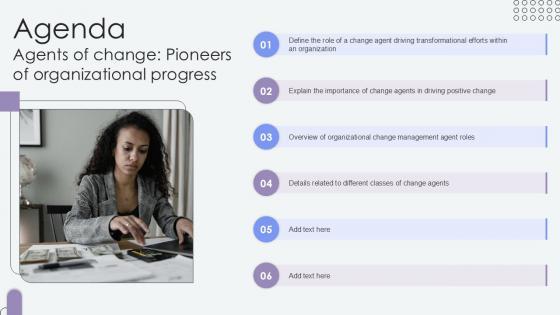 Create an editable Agenda Agents Of Change Pioneers Of Organizational Progress PPT Example CM SS V that communicates your idea and engages your audience. Whether you are presenting a business or an educational presentation, pre-designed presentation templates help save time. Agenda Agents Of Change Pioneers Of Organizational Progress PPT Example CM SS V is highly customizable and very easy to edit, covering many different styles from creative to business presentations. Slidegeeks has creative team members who have crafted amazing templates. So, go and get them without any delay. Our Agenda Agents Of Change Pioneers Of Organizational Progress PPT Example CM SS V are topically designed to provide an attractive backdrop to any subject. Use them to look like a presentation pro.