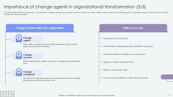 This slide defines that change agents play an essential role in helping organizations successfully implement change. It consists of details about the importance of change agents in organizations that are better prepared to manage change and achieve their goals. This modern and well-arranged Importance Of Change Agents In Agents Of Change Pioneers PPT Template CM SS V provides lots of creative possibilities. It is very simple to customize and edit with the Powerpoint Software. Just drag and drop your pictures into the shapes. All facets of this template can be edited with Powerpoint, no extra software is necessary. Add your own material, put your images in the places assigned for them, adjust the colors, and then you can show your slides to the world, with an animated slide included. This slide defines that change agents play an essential role in helping organizations successfully implement change. It consists of details about the importance of change agents in organizations that are better prepared to manage change and achieve their goals.