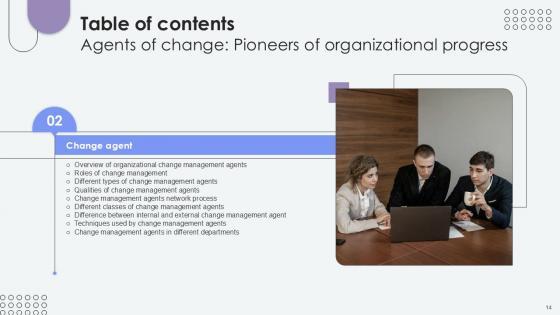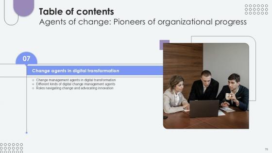 If your project calls for a presentation, then Slidegeeks is your go-to partner because we have professionally designed, easy-to-edit templates that are perfect for any presentation. After downloading, you can easily edit Table Of Contents Agents Of Change Pioneers Of Organizational Progress PPT Presentation CM SS V and make the changes accordingly. You can rearrange slides or fill them with different images. Check out all the handy templates Our Table Of Contents Agents Of Change Pioneers Of Organizational Progress PPT Presentation CM SS V are topically designed to provide an attractive backdrop to any subject. Use them to look like a presentation pro.