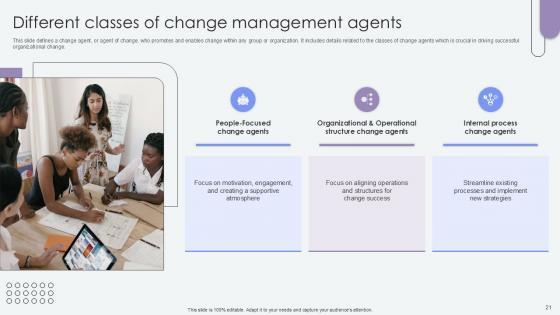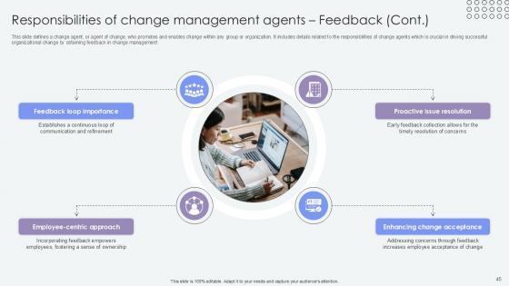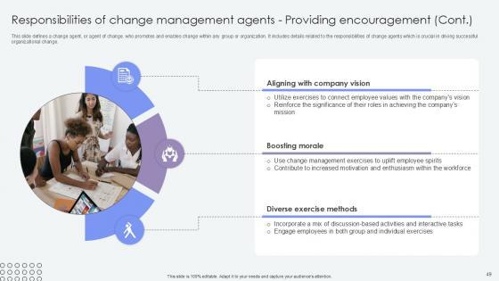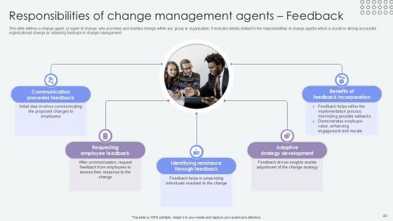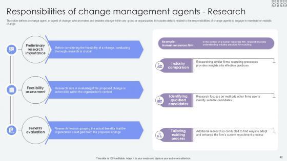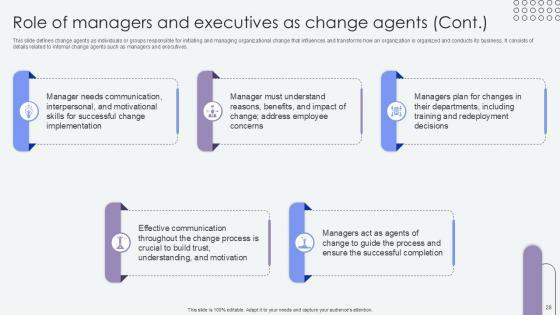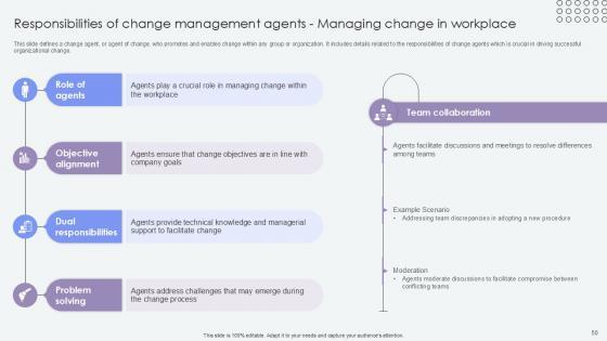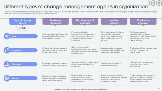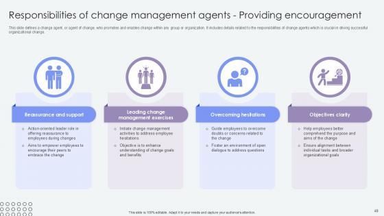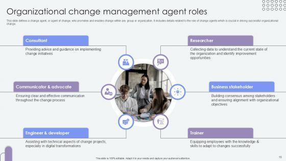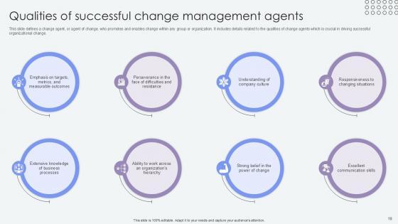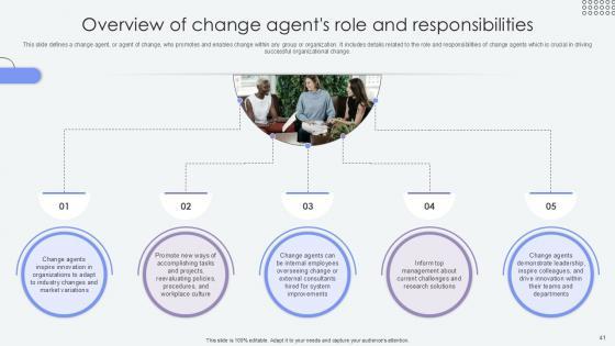 This slide defines a change agent, or agent of change, who promotes and enables change within any group or organization. It includes details related to the role and responsibilities of change agents which is crucial in driving successful organizational change. The Overview Of Change Agents Role Agents Of Change Pioneers PPT Template CM SS V is a compilation of the most recent design trends as a series of slides. It is suitable for any subject or industry presentation, containing attractive visuals and photo spots for businesses to clearly express their messages. This template contains a variety of slides for the user to input data, such as structures to contrast two elements, bullet points, and slides for written information. Slidegeeks is prepared to create an impression. This slide defines a change agent, or agent of change, who promotes and enables change within any group or organization. It includes details related to the role and responsibilities of change agents which is crucial in driving successful organizational change.