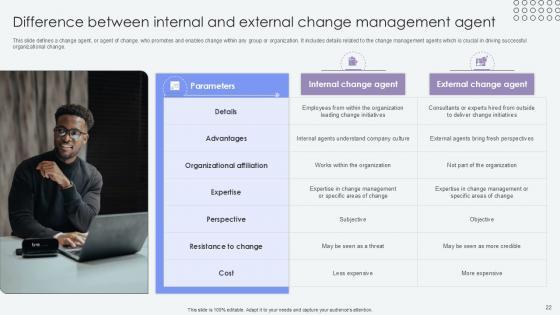 This slide defines a change agent, or agent of change, who promotes and enables change within any group or organization. It includes details related to the change management agents which is crucial in driving successful organizational change. Find highly impressive Difference Between Internal And External Agents Of Change Pioneers PPT Template CM SS V on Slidegeeks to deliver a meaningful presentation. You can save an ample amount of time using these presentation templates. No need to worry to prepare everything from scratch because Slidegeeks experts have already done a huge research and work for you. You need to download Difference Between Internal And External Agents Of Change Pioneers PPT Template CM SS V for your upcoming presentation. All the presentation templates are 100 percent editable and you can change the color and personalize the content accordingly. Download now This slide defines a change agent, or agent of change, who promotes and enables change within any group or organization. It includes details related to the change management agents which is crucial in driving successful organizational change.