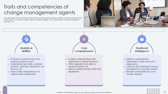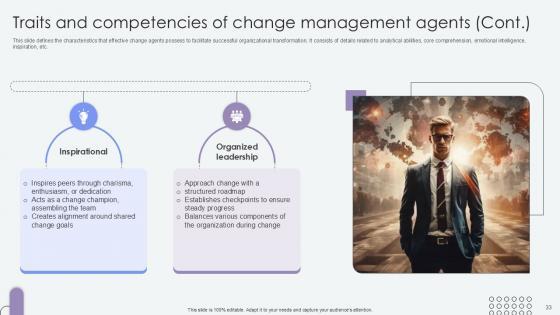 This slide defines the characteristics that effective change agents possess to facilitate successful organizational transformation. It consists of details related to analytical abilities, core comprehension, emotional intelligence, inspiration, etc. Are you in need of a template that can accommodate all of your creative concepts This one is crafted professionally and can be altered to fit any style. Use it with Google Slides or PowerPoint. Include striking photographs, symbols, depictions, and other visuals. Fill, move around, or remove text boxes as desired. Test out color palettes and font mixtures. Edit and save your work, or work with colleagues. Download Traits And Competencies Of Change Agents Of Change Pioneers PPT Presentation CM SS V and observe how to make your presentation outstanding. Give an impeccable presentation to your group and make your presentation unforgettable. This slide defines the characteristics that effective change agents possess to facilitate successful organizational transformation. It consists of details related to analytical abilities, core comprehension, emotional intelligence, inspiration, etc.