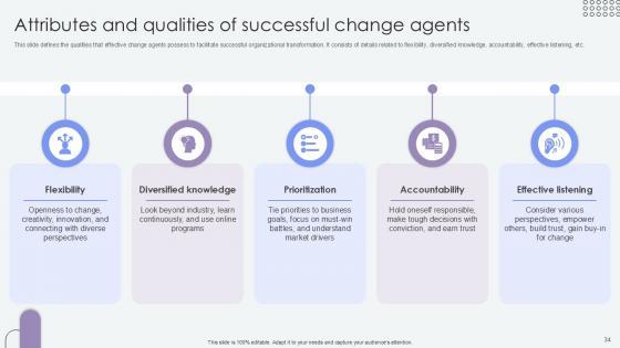 This slide defines the qualities that effective change agents possess to facilitate successful organizational transformation. It consists of details related to flexibility, diversified knowledge, accountability, effective listening, etc. Slidegeeks is one of the best resources for PowerPoint templates. You can download easily and regulate Attributes And Qualities Of Agents Of Change Pioneers PPT PowerPoint CM SS V for your personal presentations from our wonderful collection. A few clicks is all it takes to discover and get the most relevant and appropriate templates. Use our Templates to add a unique zing and appeal to your presentation and meetings. All the slides are easy to edit and you can use them even for advertisement purposes. This slide defines the qualities that effective change agents possess to facilitate successful organizational transformation. It consists of details related to flexibility, diversified knowledge, accountability, effective listening, etc.