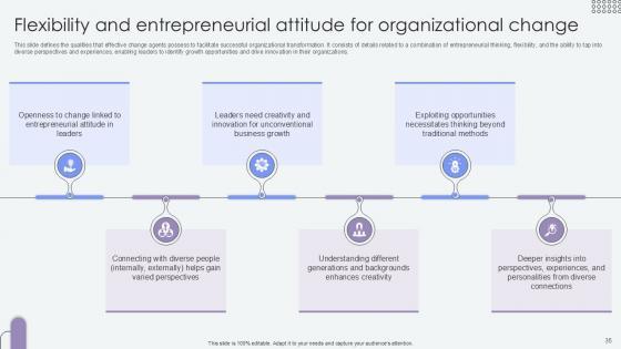 This slide defines the qualities that effective change agents possess to facilitate successful organizational transformation. It consists of details related to a combination of entrepreneurial thinking, flexibility, and the ability to tap into diverse perspectives and experiences, enabling leaders to identify growth opportunities and drive innovation in their organizations. Formulating a presentation can take up a lot of effort and time, so the content and message should always be the primary focus. The visuals of the PowerPoint can enhance the presenters message, so our Flexibility And Entrepreneurial Attitude Agents Of Change Pioneers PPT Template CM SS V was created to help save time. Instead of worrying about the design, the presenter can concentrate on the message while our designers work on creating the ideal templates for whatever situation is needed. Slidegeeks has experts for everything from amazing designs to valuable content, we have put everything into Flexibility And Entrepreneurial Attitude Agents Of Change Pioneers PPT Template CM SS V This slide defines the qualities that effective change agents possess to facilitate successful organizational transformation. It consists of details related to a combination of entrepreneurial thinking, flexibility, and the ability to tap into diverse perspectives and experiences, enabling leaders to identify growth opportunities and drive innovation in their organizations.