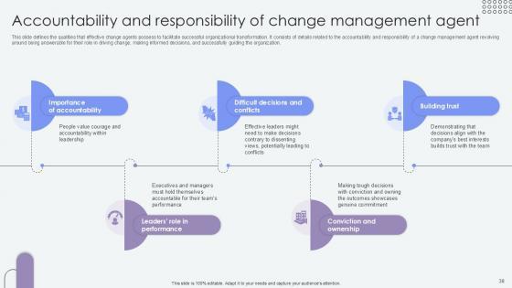 This slide defines the qualities that effective change agents possess to facilitate successful organizational transformation. It consists of details related to the accountability and responsibility of a change management agent revolving around being answerable for their role in driving change, making informed decisions, and successfully guiding the organization. Find a pre-designed and impeccable Accountability And Responsibility Of Agents Of Change Pioneers PPT Slide CM SS V. The templates can ace your presentation without additional effort. You can download these easy-to-edit presentation templates to make your presentation stand out from others. So, what are you waiting for Download the template from Slidegeeks today and give a unique touch to your presentation. This slide defines the qualities that effective change agents possess to facilitate successful organizational transformation. It consists of details related to the accountability and responsibility of a change management agent revolving around being answerable for their role in driving change, making informed decisions, and successfully guiding the organization.