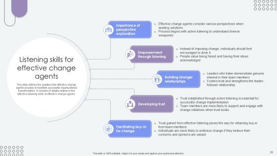 This slide defines the qualities that effective change agents possess to facilitate successful organizational transformation. It consists of details related to the effective listening skills of effective change agents. Welcome to our selection of the Listening Skills For Effective Agents Of Change Pioneers PPT Example CM SS V. These are designed to help you showcase your creativity and bring your sphere to life. Planning and Innovation are essential for any business that is just starting out. This collection contains the designs that you need for your everyday presentations. All of our PowerPoints are 100Percent editable, so you can customize them to suit your needs. This multi-purpose template can be used in various situations. Grab these presentation templates today. This slide defines the qualities that effective change agents possess to facilitate successful organizational transformation. It consists of details related to the effective listening skills of effective change agents.