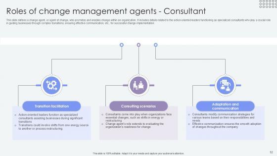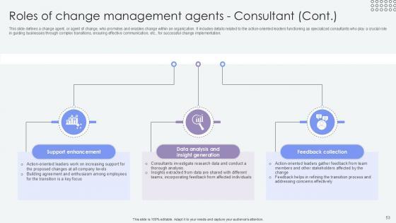 This slide defines a change agent, or agent of change, who promotes and enables change within an organization. It includes details related to the action-oriented leaders functioning as specialized consultants who play a crucial role in guiding businesses through complex transitions, ensuring effective communication, etc., for successful change implementation. Present like a pro with Roles Of Change Management Agents Consultant Agents Of Change Pioneers PPT Presentation CM SS V. Create beautiful presentations together with your team, using our easy-to-use presentation slides. Share your ideas in real-time and make changes on the fly by downloading our templates. So whether you are in the office, on the go, or in a remote location, you can stay in sync with your team and present your ideas with confidence. With Slidegeeks presentation got a whole lot easier. Grab these presentations today. This slide defines a change agent, or agent of change, who promotes and enables change within an organization. It includes details related to the action-oriented leaders functioning as specialized consultants who play a crucial role in guiding businesses through complex transitions, ensuring effective communication, etc., for successful change implementation.