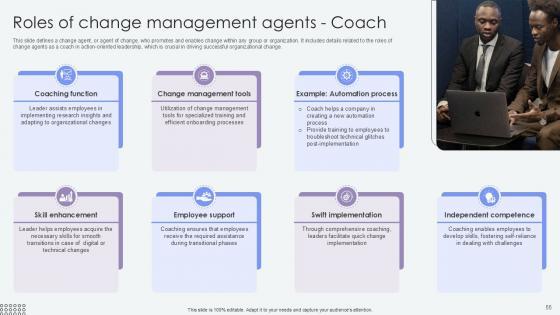 This slide defines a change agent, or agent of change, who promotes and enables change within any group or organization. It includes details related to the roles of change agents as a coach in action-oriented leadership, which is crucial in driving successful organizational change. From laying roadmaps to briefing everything in detail, our templates are perfect for you. You can set the stage with your presentation slides. All you have to do is download these easy-to-edit and customizable templates. Roles Of Change Management Agents Coach Agents Of Change Pioneers PPT Sample CM SS V will help you deliver an outstanding performance that everyone would remember and praise you for. Do download this presentation today. This slide defines a change agent, or agent of change, who promotes and enables change within any group or organization. It includes details related to the roles of change agents as a coach in action-oriented leadership, which is crucial in driving successful organizational change.