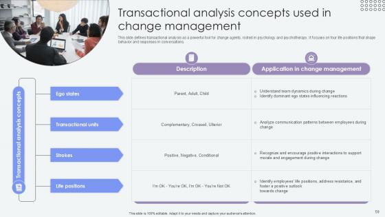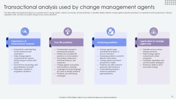 This slide defines transactional analysis as a powerful tool for change agents, rooted in psychology and psychotherapy. It specifies details related to change agents using this technique to comprehend human perspectives, enhance negotiation skills, and drive successful change across various situations. Make sure to capture your audiences attention in your business displays with our gratis customizable Transactional Analysis Used By Agents Of Change Pioneers PPT Sample CM SS V. These are great for business strategies, office conferences, capital raising or task suggestions. If you desire to acquire more customers for your tech business and ensure they stay satisfied, create your own sales presentation with these plain slides. This slide defines transactional analysis as a powerful tool for change agents, rooted in psychology and psychotherapy. It specifies details related to change agents using this technique to comprehend human perspectives, enhance negotiation skills, and drive successful change across various situations.