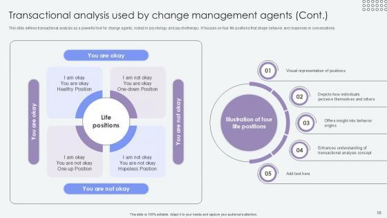 This slide defines transactional analysis as a powerful tool for change agents, rooted in psychology and psychotherapy. It focuses on four life positions that shape behavior and responses in conversations. Crafting an eye-catching presentation has never been more straightforward. Let your presentation shine with this tasteful yet straightforward Transactional Analysis Concepts Used Agents Of Change Pioneers PPT Example CM SS V template. It offers a minimalistic and classy look that is great for making a statement. The colors have been employed intelligently to add a bit of playfulness while still remaining professional. Construct the ideal Transactional Analysis Concepts Used Agents Of Change Pioneers PPT Example CM SS V that effortlessly grabs the attention of your audience Begin now and be certain to wow your customers This slide defines transactional analysis as a powerful tool for change agents, rooted in psychology and psychotherapy. It focuses on four life positions that shape behavior and responses in conversations.
