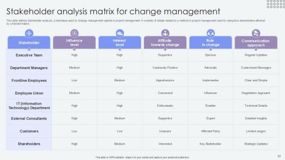 This slide defines stakeholder analysis, a technique used by change management agents in project management. It consists of details related to a method in project management used to categorize stakeholders affected by a transformation. Slidegeeks is here to make your presentations a breeze with Stakeholder Analysis Matrix For Agents Of Change Pioneers PPT Example CM SS V With our easy-to-use and customizable templates, you can focus on delivering your ideas rather than worrying about formatting. With a variety of designs to choose from, you are sure to find one that suits your needs. And with animations and unique photos, illustrations, and fonts, you can make your presentation pop. So whether you are giving a sales pitch or presenting to the board, make sure to check out Slidegeeks first This slide defines stakeholder analysis, a technique used by change management agents in project management. It consists of details related to a method in project management used to categorize stakeholders affected by a transformation.