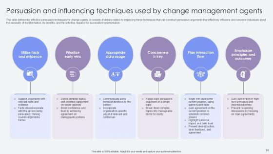 This slide defines the effective persuasion techniques for change agents. It consists of details related to employing these techniques that can construct persuasive arguments that effectively influence and convince individuals about the necessity of transformation, its benefits, and the activities required for successful implementation. Presenting this PowerPoint presentation, titled Persuasion And Influencing Techniques Agents Of Change Pioneers PPT Template CM SS V, with topics curated by our researchers after extensive research. This editable presentation is available for immediate download and provides attractive features when used. Download now and captivate your audience. Presenting this Persuasion And Influencing Techniques Agents Of Change Pioneers PPT Template CM SS V. Our researchers have carefully researched and created these slides with all aspects taken into consideration. This is a completely customizable Persuasion And Influencing Techniques Agents Of Change Pioneers PPT Template CM SS V that is available for immediate downloading. Download now and make an impact on your audience. Highlight the attractive features available with our PPTs. This slide defines the effective persuasion techniques for change agents. It consists of details related to employing these techniques that can construct persuasive arguments that effectively influence and convince individuals about the necessity of transformation, its benefits, and the activities required for successful implementation.
