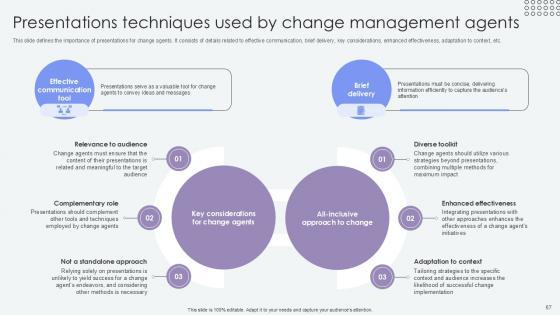 This slide defines the importance of presentations for change agents. It consists of details related to effective communication, brief delivery, key considerations, enhanced effectiveness, adaptation to context, etc. Here you can discover an assortment of the finest PowerPoint and Google Slides templates. With these templates, you can create presentations for a variety of purposes while simultaneously providing your audience with an eye-catching visual experience. Download Presentations Techniques Used By Agents Of Change Pioneers PPT Presentation CM SS V to deliver an impeccable presentation. These templates will make your job of preparing presentations much quicker, yet still, maintain a high level of quality. Slidegeeks has experienced researchers who prepare these templates and write high-quality content for you. Later on, you can personalize the content by editing the Presentations Techniques Used By Agents Of Change Pioneers PPT Presentation CM SS V. This slide defines the importance of presentations for change agents. It consists of details related to effective communication, brief delivery, key considerations, enhanced effectiveness, adaptation to context, etc.