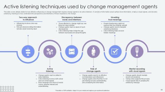 This slide covers details related to how effective influencing in change management requires change agents to be active listeners. It consists of information about surface-level information, employs visual signals, and decodes underlying meanings to truly understand the perspectives and intentions of those impacted by the change. Boost your pitch with our creative Active Listening Techniques Used By Agents Of Change Pioneers PPT Template CM SS V. Deliver an awe-inspiring pitch that will mesmerize everyone. Using these presentation templates you will surely catch everyones attention. You can browse the ppts collection on our website. We have researchers who are experts at creating the right content for the templates. So you do not have to invest time in any additional work. Just grab the template now and use them. This slide covers details related to how effective influencing in change management requires change agents to be active listeners. It consists of information about surface-level information, employs visual signals, and decodes underlying meanings to truly understand the perspectives and intentions of those impacted by the change.