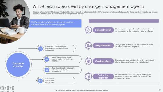 This slide defines the WIIFM technique, Whats In It For Me. It consists of details related to the WIIFM technique, which is an effective way for change agents to bridge the gap between the change initiatives goals and the stakeholders perceptions and concerns. Coming up with a presentation necessitates that the majority of the effort goes into the content and the message you intend to convey. The visuals of a PowerPoint presentation can only be effective if it supplements and supports the story that is being told. Keeping this in mind our experts created WIIFM Techniques Used By Agents Of Change Pioneers PPT Template CM SS V to reduce the time that goes into designing the presentation. This way, you can concentrate on the message while our designers take care of providing you with the right template for the situation. This slide defines the WIIFM technique, Whats In It For Me. It consists of details related to the WIIFM technique, which is an effective way for change agents to bridge the gap between the change initiatives goals and the stakeholders perceptions and concerns.