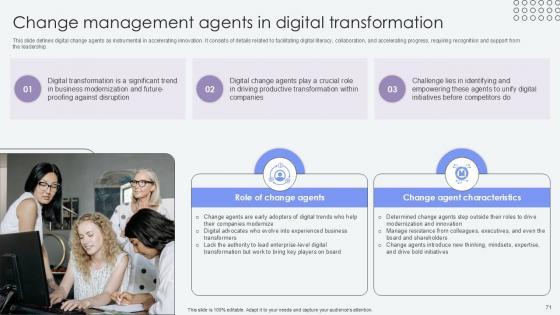 This slide defines digital change agents as instrumental in accelerating innovation. It consists of details related to facilitating digital literacy, collaboration, and accelerating progress, requiring recognition and support from the leadership. Slidegeeks is here to make your presentations a breeze with Change Management Agents In Digital Agents Of Change Pioneers PPT Sample CM SS V With our easy-to-use and customizable templates, you can focus on delivering your ideas rather than worrying about formatting. With a variety of designs to choose from, you are sure to find one that suits your needs. And with animations and unique photos, illustrations, and fonts, you can make your presentation pop. So whether you are giving a sales pitch or presenting to the board, make sure to check out Slidegeeks first This slide defines digital change agents as instrumental in accelerating innovation. It consists of details related to facilitating digital literacy, collaboration, and accelerating progress, requiring recognition and support from the leadership.