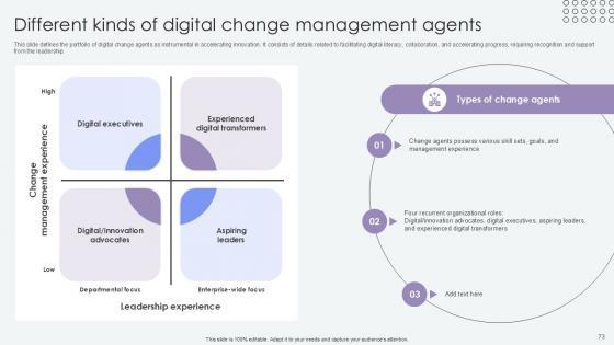 This slide defines the portfolio of digital change agents as instrumental in accelerating innovation. It consists of details related to facilitating digital literacy, collaboration, and accelerating progress, requiring recognition and support from the leadership. If you are looking for a format to display your unique thoughts, then the professionally designed Different Kinds Of Digital Change Agents Of Change Pioneers PPT PowerPoint CM SS V is the one for you. You can use it as a Google Slides template or a PowerPoint template. Incorporate impressive visuals, symbols, images, and other charts. Modify or reorganize the text boxes as you desire. Experiment with shade schemes and font pairings. Alter, share or cooperate with other people on your work. Download Different Kinds Of Digital Change Agents Of Change Pioneers PPT PowerPoint CM SS V and find out how to give a successful presentation. Present a perfect display to your team and make your presentation unforgettable. This slide defines the portfolio of digital change agents as instrumental in accelerating innovation. It consists of details related to facilitating digital literacy, collaboration, and accelerating progress, requiring recognition and support from the leadership.