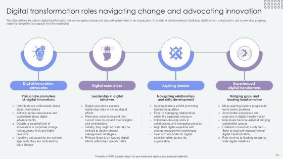 This slide defines the roles in digital transformation that are navigating change and advocating innovation in an organization. It consists of details related to facilitating digital literacy, collaboration, and accelerating progress, requiring recognition and support from the leadership. Crafting an eye-catching presentation has never been more straightforward. Let your presentation shine with this tasteful yet straightforward Digital Transformation Roles Navigating Agents Of Change Pioneers PPT Sample CM SS V template. It offers a minimalistic and classy look that is great for making a statement. The colors have been employed intelligently to add a bit of playfulness while still remaining professional. Construct the ideal Digital Transformation Roles Navigating Agents Of Change Pioneers PPT Sample CM SS V that effortlessly grabs the attention of your audience Begin now and be certain to wow your customers This slide defines the roles in digital transformation that are navigating change and advocating innovation in an organization. It consists of details related to facilitating digital literacy, collaboration, and accelerating progress, requiring recognition and support from the leadership.