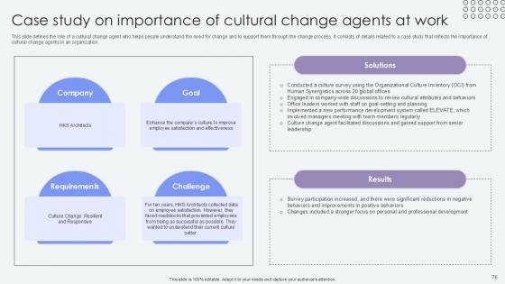 This slide defines the role of a cultural change agent who helps people understand the need for change and to support them through the change process. It consists of details related to a case study that reflects the importance of cultural change agents in an organization. Do you have to make sure that everyone on your team knows about any specific topic I yes, then you should give Case Study On Importance Of Cultural Agents Of Change Pioneers PPT Sample CM SS V a try. Our experts have put a lot of knowledge and effort into creating this impeccable Case Study On Importance Of Cultural Agents Of Change Pioneers PPT Sample CM SS V. You can use this template for your upcoming presentations, as the slides are perfect to represent even the tiniest detail. You can download these templates from the Slidegeeks website and these are easy to edit. So grab these today This slide defines the role of a cultural change agent who helps people understand the need for change and to support them through the change process. It consists of details related to a case study that reflects the importance of cultural change agents in an organization.