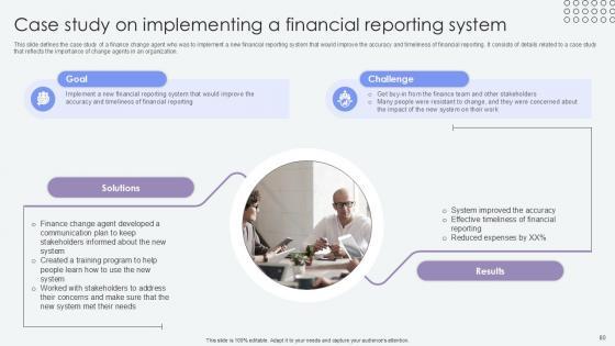 This slide defines the case study of a finance change agent who was to implement a new financial reporting system that would improve the accuracy and timeliness of financial reporting. It consists of details related to a case study that reflects the importance of change agents in an organization. Want to ace your presentation in front of a live audience Our Case Study On Implementing A Financial Agents Of Change Pioneers PPT PowerPoint CM SS V can help you do that by engaging all the users towards you. Slidegeeks experts have put their efforts and expertise into creating these impeccable powerpoint presentations so that you can communicate your ideas clearly. Moreover, all the templates are customizable, and easy-to-edit and downloadable. Use these for both personal and commercial use. This slide defines the case study of a finance change agent who was to implement a new financial reporting system that would improve the accuracy and timeliness of financial reporting. It consists of details related to a case study that reflects the importance of change agents in an organization.