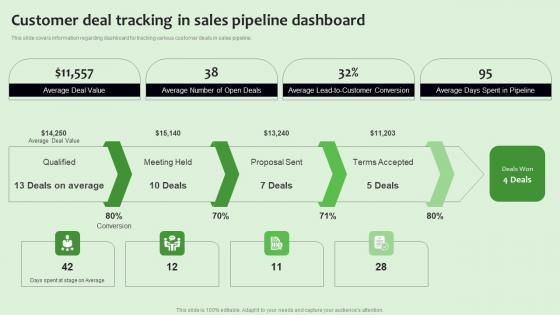 This slide covers information regarding dashboard for tracking various customer deals in sales pipeline. Whether you have daily or monthly meetings, a brilliant presentation is necessary. Customer Deal Tracking In Sales Pipeline Dashboard Strategies To Manage Sales Funnel Sample Pdf can be your best option for delivering a presentation. Represent everything in detail using Customer Deal Tracking In Sales Pipeline Dashboard Strategies To Manage Sales Funnel Sample Pdf and make yourself stand out in meetings. The template is versatile and follows a structure that will cater to your requirements. All the templates prepared by Slidegeeks are easy to download and edit. Our research experts have taken care of the corporate themes as well. So, give it a try and see the results. This slide covers information regarding dashboard for tracking various customer deals in sales pipeline.