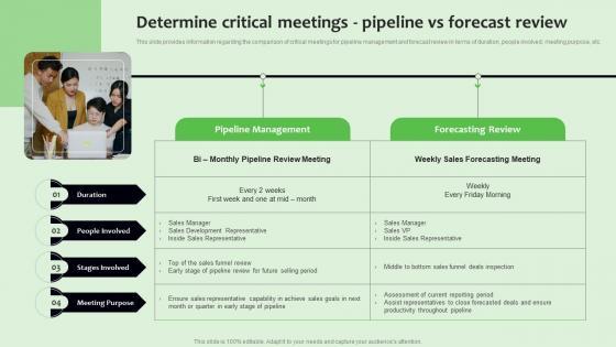 This slide provides information regarding the comparison of critical meetings for pipeline management and forecast review in terms of duration, people involved, meeting purpose, etc. If you are looking for a format to display your unique thoughts, then the professionally designed Determine Critical Meetings Pipeline Vs Strategies To Manage Sales Funnel Pictures Pdf is the one for you. You can use it as a Google Slides template or a PowerPoint template. Incorporate impressive visuals, symbols, images, and other charts. Modify or reorganize the text boxes as you desire. Experiment with shade schemes and font pairings. Alter, share or cooperate with other people on your work. Download Determine Critical Meetings Pipeline Vs Strategies To Manage Sales Funnel Pictures Pdf and find out how to give a successful presentation. Present a perfect display to your team and make your presentation unforgettable. This slide provides information regarding the comparison of critical meetings for pipeline management and forecast review in terms of duration, people involved, meeting purpose, etc.