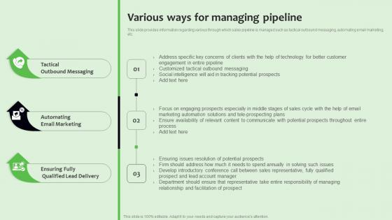 This slide provides information regarding various through which sales pipeline is managed such as tactical outbound messaging, automating email marketing, etc. There are so many reasons you need a Various Ways For Managing Pipeline Strategies To Manage Sales Funnel Sample Pdf. The first reason is you can not spend time making everything from scratch, Thus, Slidegeeks has made presentation templates for you too. You can easily download these templates from our website easily. This slide provides information regarding various through which sales pipeline is managed such as tactical outbound messaging, automating email marketing, etc.