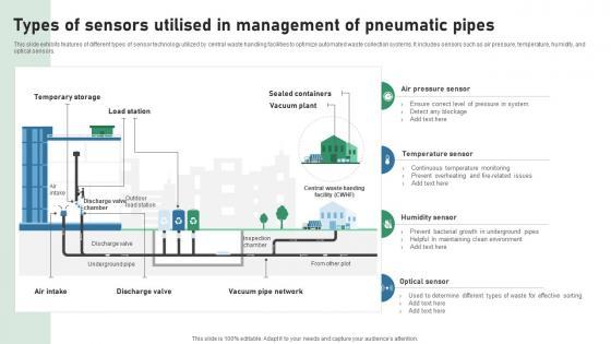 This slide exhibits features of different types of sensor technology utilized by central waste handling facilities to optimize automated waste collection systems. It includes sensors such as air pressure, temperature, humidity, and optical sensors. From laying roadmaps to briefing everything in detail, our templates are perfect for you. You can set the stage with your presentation slides. All you have to do is download these easy-to-edit and customizable templates. Types Of Sensors Utilised In Management Of Pneumatic Pipes IOT Applications In Smart Waste IoT SS V will help you deliver an outstanding performance that everyone would remember and praise you for. Do download this presentation today. This slide exhibits features of different types of sensor technology utilized by central waste handling facilities to optimize automated waste collection systems. It includes sensors such as air pressure, temperature, humidity, and optical sensors.