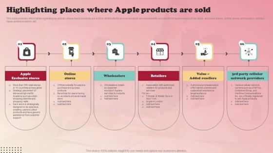 This slide provides information regarding key places where Apple products are sold or distributed to ensure products are conveniently accessible for customers such as Apple exclusive stores, online stores, wholesalers, retailers, value added resellers, etc. Welcome to our selection of the Highlighting Places Where Apple Branding Strategy To Become Market Leader Graphics Pdf. These are designed to help you showcase your creativity and bring your sphere to life. Planning and Innovation are essential for any business that is just starting out. This collection contains the designs that you need for your everyday presentations. All of our PowerPoints are 100 percent editable, so you can customize them to suit your needs. This multi purpose template can be used in various situations. Grab these presentation templates today This slide provides information regarding key places where Apple products are sold or distributed to ensure products are conveniently accessible for customers such as Apple exclusive stores, online stores, wholesalers, retailers, value added resellers, etc.