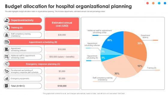 The slide highlights budget allocation matrix in organizational planning. This includes departments, estimated annual cost and percentage share. Create an editable Budget Allocation For Hospital Comprehensive Approach To Strategic Planning Ppt Example that communicates your idea and engages your audience. Whether you are presenting a business or an educational presentation, pre-designed presentation templates help save time. Budget Allocation For Hospital Comprehensive Approach To Strategic Planning Ppt Example is highly customizable and very easy to edit, covering many different styles from creative to business presentations. Slidegeeks has creative team members who have crafted amazing templates. So, go and get them without any delay. The slide highlights budget allocation matrix in organizational planning. This includes departments, estimated annual cost and percentage share.