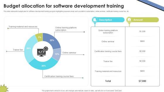 This slide represents budget plan for software development training program highlighting expense areas such as platform subscription, online seminar, certificate training course fee, etc. Boost your pitch with our creative Budget Allocation For Software Skill Building Plan For Application PPT PowerPoint DTE SS V. Deliver an awe-inspiring pitch that will mesmerize everyone. Using these presentation templates you will surely catch everyones attention. You can browse the ppts collection on our website. We have researchers who are experts at creating the right content for the templates. So you do not have to invest time in any additional work. Just grab the template now and use them. This slide represents budget plan for software development training program highlighting expense areas such as platform subscription, online seminar, certificate training course fee, etc.