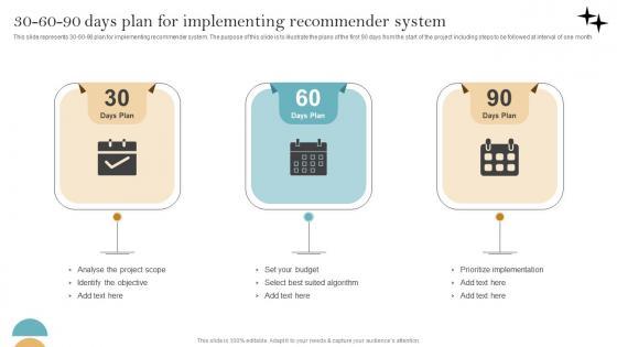 This slide represents 30-60-90 plan for implementing recommender system. The purpose of this slide is to illustrate the plans of the first 90 days from the start of the project including steps to be followed at interval of one month. Do you have to make sure that everyone on your team knows about any specific topic I yes, then you should give Recommendation Techniques 30 60 90 Days Plan For Implementing Recommender System Introduction PDF a try. Our experts have put a lot of knowledge and effort into creating this impeccable Recommendation Techniques 30 60 90 Days Plan For Implementing Recommender System Introduction PDF. You can use this template for your upcoming presentations, as the slides are perfect to represent even the tiniest detail. You can download these templates from the Slidegeeks website and these are easy to edit. So grab these today This slide represents 30-60-90 plan for implementing recommender system. The purpose of this slide is to illustrate the plans of the first 90 days from the start of the project including steps to be followed at interval of one month.