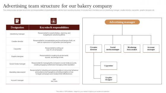 This slide provides glimpse about roles and responsibilities of advertising team with the team reporting structure. It includes team members such as advertising manager, creative director, copywriter, graphic designer, etc.Are you searching for a Advertising Team Structure For Our Bakery Strategic Advertising Plan For Bakehouse Formats Pdf that is uncluttered, straightforward, and original Its easy to edit, and you can change the colors to suit your personal or business branding. For a presentation that expresses how much effort you have put in, this template is ideal. With all of its features, including tables, diagrams, statistics, and lists, its perfect for a business plan presentation. Make your ideas more appealing with these professional slides. Download Advertising Team Structure For Our Bakery Strategic Advertising Plan For Bakehouse Formats Pdf from Slidegeeks today. This slide provides glimpse about roles and responsibilities of advertising team with the team reporting structure. It includes team members such as advertising manager, creative director, copywriter, graphic designer, etc.