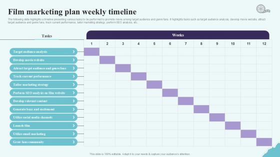 The following slide highlights a timeline presenting various tasks to be performed to promote movie among target audience and genre fans. It highlights tasks such as target audience analysis, develop movie website, attract target audience and genre fans, track current performance, tailor marketing strategy, perform SEO analysis, etc. Crafting an eye-catching presentation has never been more straightforward. Let your presentation shine with this tasteful yet straightforward Film Marketing Plan Weekly Timeline Strategic Plan To Increase Film Ppt Template Strategy SS V template. It offers a minimalistic and classy look that is great for making a statement. The colors have been employed intelligently to add a bit of playfulness while still remaining professional. Construct the ideal Film Marketing Plan Weekly Timeline Strategic Plan To Increase Film Ppt Template Strategy SS V that effortlessly grabs the attention of your audience Begin now and be certain to wow your customers The following slide highlights a timeline presenting various tasks to be performed to promote movie among target audience and genre fans. It highlights tasks such as target audience analysis, develop movie website, attract target audience and genre fans, track current performance, tailor marketing strategy, perform SEO analysis, etc.