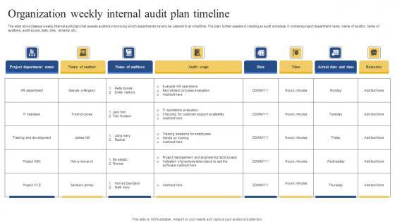 The slide showcases a weekly internal audit plan that assists auditors in knowing which departments have to be catered to at what time. The plan further assists in creating an audit schedule. It contains project department name, name of auditor, name of auditees, audit scope, date, time, remarks, etc. Showcasing this set of slides titled Organization Weekly Internal Audit Plan Timeline Background Pdf. The topics addressed in these templates are Evaluate HR Operations, Recruitment Process Evaluation, IT Operations Evaluation. All the content presented in this PPT design is completely editable. Download it and make adjustments in color, background, font etc. as per your unique business setting. The slide showcases a weekly internal audit plan that assists auditors in knowing which departments have to be catered to at what time. The plan further assists in creating an audit schedule. It contains project department name, name of auditor, name of auditees, audit scope, date, time, remarks, etc.