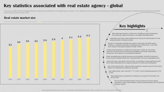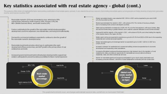 The purpose of this slide is to highlight the facts representing contribution of real estate agency globally. It also depicts the primary reasons of promoting real estate agency among people as it helps develop employment, generates income, and improve countries GDP. Coming up with a presentation necessitates that the majority of the effort goes into the content and the message you intend to convey. The visuals of a PowerPoint presentation can only be effective if it supplements and supports the story that is being told. Keeping this in mind our experts created Key Statistics Associated With Real Estate Agent Business Plan Go To Market Strategy Professional Pdf to reduce the time that goes into designing the presentation. This way, you can concentrate on the message while our designers take care of providing you with the right template for the situation. The purpose of this slide is to highlight the facts representing contribution of real estate agency globally. It also depicts the primary reasons of promoting real estate agency among people as it helps develop employment, generates income, and improve countries GDP.