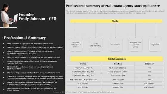 This slide highlights the founders biggest professional achievements and most valuable skills and the proven ways in which she will use those skills to achieve valuable results. It includes educational background and work experience of the key management. Explore a selection of the finest Professional Summary Of Real Estate Agent Business Plan Go To Market Strategy Background Pdf here. With a plethora of professionally designed and pre made slide templates, you can quickly and easily find the right one for your upcoming presentation. You can use our Professional Summary Of Real Estate Agent Business Plan Go To Market Strategy Background Pdf to effectively convey your message to a wider audience. Slidegeeks has done a lot of research before preparing these presentation templates. The content can be personalized and the slides are highly editable. Grab templates today from Slidegeeks. This slide highlights the founders biggest professional achievements and most valuable skills and the proven ways in which she will use those skills to achieve valuable results. It includes educational background and work experience of the key management.