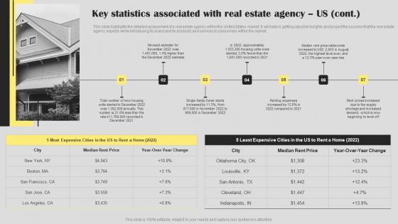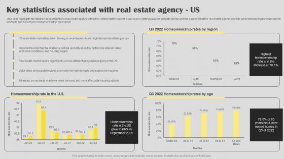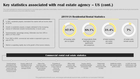 This slide highlights the detailed assessment of a real estate agency within the United States market. It will help in getting valuable insights and project the success that the real estate agency expects while introducing its brand and its products and services to consumers within the market. Presenting this PowerPoint presentation, titled Real Estate Agent Business Plan Go To Market Strategy Key Statistics Associated Real Estate Designs Pdf, with topics curated by our researchers after extensive research. This editable presentation is available for immediate download and provides attractive features when used. Download now and captivate your audience. Presenting this Real Estate Agent Business Plan Go To Market Strategy Key Statistics Associated Real Estate Designs Pdf. Our researchers have carefully researched and created these slides with all aspects taken into consideration. This is a completely customizable Real Estate Agent Business Plan Go To Market Strategy Key Statistics Associated Real Estate Designs Pdf that is available for immediate downloading. Download now and make an impact on your audience. Highlight the attractive features available with our PPTs. This slide highlights the detailed assessment of a real estate agency within the United States market. It will help in getting valuable insights and project the success that the real estate agency expects while introducing its brand and its products and services to consumers within the market.