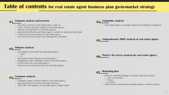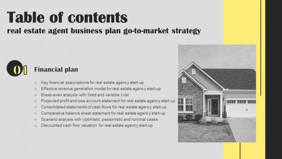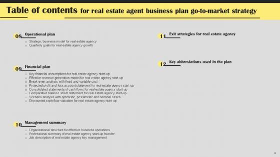Create an editable Table Of Contents For Real Estate Agent Business Plan Go To Market Strategy Template Pdf that communicates your idea and engages your audience. Whether you are presenting a business or an educational presentation, pre designed presentation templates help save time. Table Of Contents For Real Estate Agent Business Plan Go To Market Strategy Template Pdf is highly customizable and very easy to edit, covering many different styles from creative to business presentations. Slidegeeks has creative team members who have crafted amazing templates. So, go and get them without any delay. Our Table Of Contents For Real Estate Agent Business Plan Go To Market Strategy Template Pdf are topically designed to provide an attractive backdrop to any subject. Use them to look like a presentation pro.