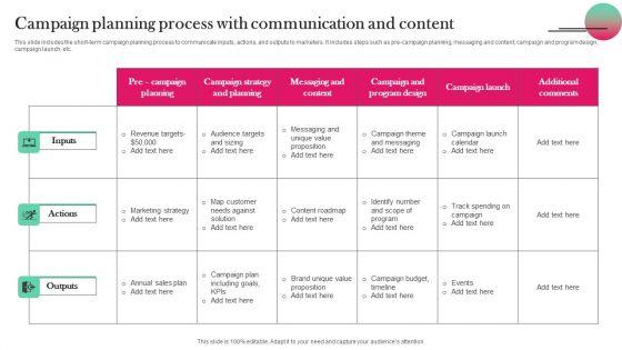 This slide includes the short-term campaign planning process to communicate inputs, actions, and outputs to marketers. It includes steps such as pre-campaign planning, messaging and content, campaign and program design, campaign launch, etc. Showcasing this set of slides titled Campaign Planning Process With Communication And Content Infographics PDF. The topics addressed in these templates are Inputs, Actions, Outputs . All the content presented in this PPT design is completely editable. Download it and make adjustments in color, background, font etc. as per your unique business setting.