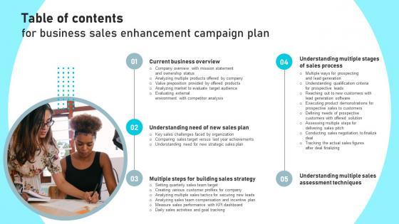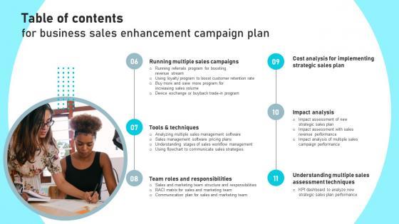 Find a pre designed and impeccable Table Of Contents For Business Sales Enhancement Campaign Plan Inspiration Pdf. The templates can ace your presentation without additional effort. You can download these easy to edit presentation templates to make your presentation stand out from others. So, what are you waiting for Download the template from Slidegeeks today and give a unique touch to your presentation. Our Table Of Contents For Business Sales Enhancement Campaign Plan Inspiration Pdf are topically designed to provide an attractive backdrop to any subject. Use them to look like a presentation pro.