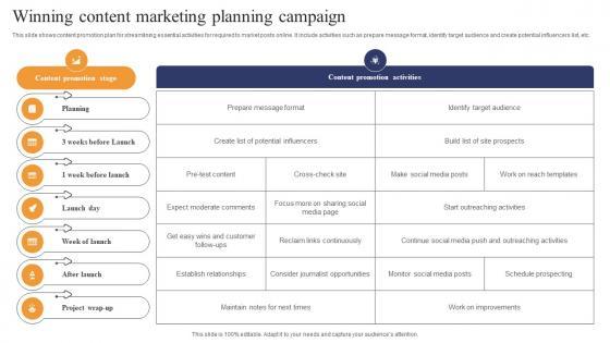 This slide shows content promotion plan for streamlining essential activities for required to market posts online. It include activities such as prepare message format, identify target audience and create potential influencers list, etc. Pitch your topic with ease and precision using this Winning Content Marketing Planning Campaign Designs Pdf This layout presents information on Content Promotion Stage, Planning, Project Wrap Up It is also available for immediate download and adjustment. So, changes can be made in the color, design, graphics or any other component to create a unique layout. This slide shows content promotion plan for streamlining essential activities for required to market posts online. It include activities such as prepare message format, identify target audience and create potential influencers list, etc.