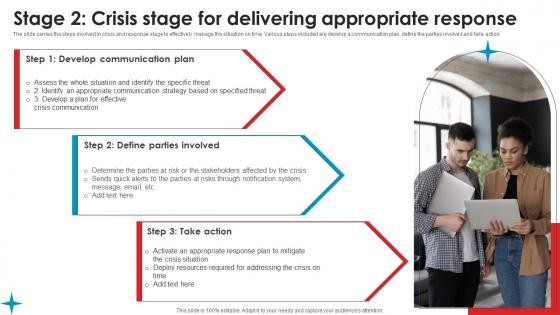 The slide carries the steps involved in crisis and response stage to effectively manage the situation on time. Various steps included are develop a communication plan, define the parties involved and take action Welcome to our selection of the Stage 2 Crisis Stage For Delivering Strategic Guide Crisis Communication Planning Pictures Pdf. These are designed to help you showcase your creativity and bring your sphere to life. Planning and Innovation are essential for any business that is just starting out. This collection contains the designs that you need for your everyday presentations. All of our PowerPoints are 100 percent editable, so you can customize them to suit your needs. This multi purpose template can be used in various situations. Grab these presentation templates today The slide carries the steps involved in crisis and response stage to effectively manage the situation on time. Various steps included are develop a communication plan, define the parties involved and take action