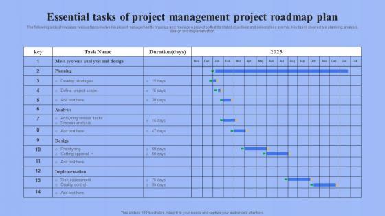 The following slide showcases various tasks involved in project management to organize and manage a project so that its stated objectives and deliverables are met. Key tasks covered are planning, analysis, design and implementation. Showcasing this set of slides titled Essential Tasks Of Project Management Project Roadmap Plan Ppt File Example Topics pdf. The topics addressed in these templates are Planning, Analysis, Design And Implementation. All the content presented in this PPT design is completely editable. Download it and make adjustments in color, background, font etc. as per your unique business setting. The following slide showcases various tasks involved in project management to organize and manage a project so that its stated objectives and deliverables are met. Key tasks covered are planning, analysis, design and implementation.