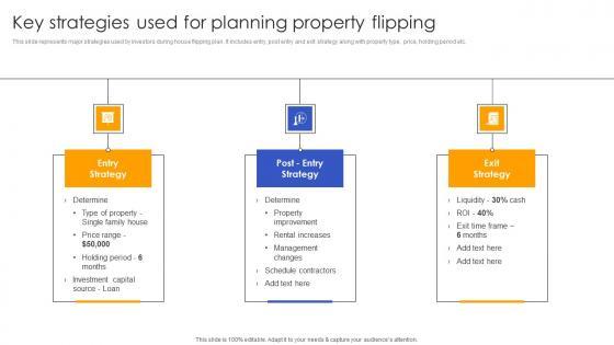 This slide represents major strategies used by investors during house flipping plan. It includes entry, post entry and exit strategy along with property type, price, holding period etc. Here you can discover an assortment of the finest PowerPoint and Google Slides templates. With these templates, you can create presentations for a variety of purposes while simultaneously providing your audience with an eye catching visual experience. Download Strategies For Flipping Houses For Maximum Revenue Key Strategies Used For Planning Property Flipping Structure PDF to deliver an impeccable presentation. These templates will make your job of preparing presentations much quicker, yet still, maintain a high level of quality. Slidegeeks has experienced researchers who prepare these templates and write high quality content for you. Later on, you can personalize the content by editing the Strategies For Flipping Houses For Maximum Revenue Key Strategies Used For Planning Property Flipping Structure PDF.